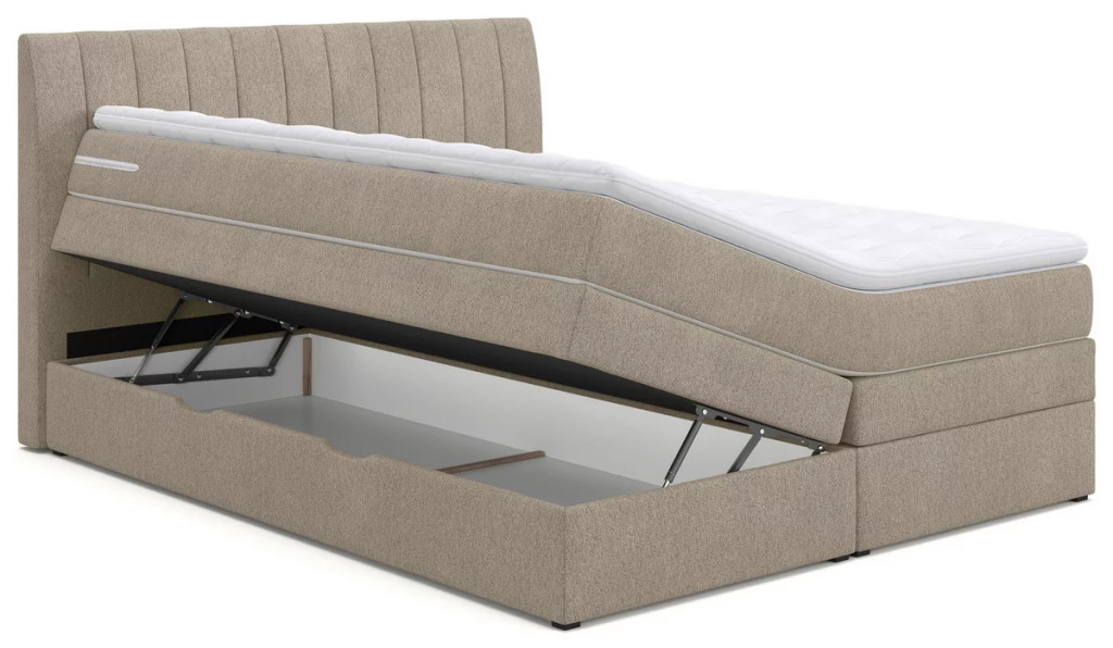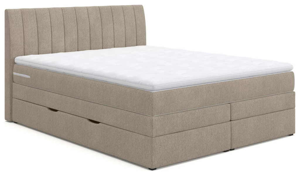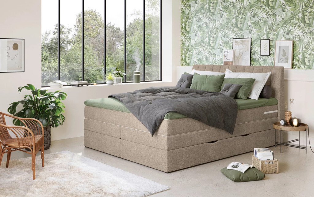 Boxspring ágy bézs színű huzattal, mely stílusos és kényelmes megoldás hálószobádba. A kárpitozott fejvég elegáns megjelenést biztosít, miközben extra támaszt nyújt olvasáshoz vagy pihenéshez.