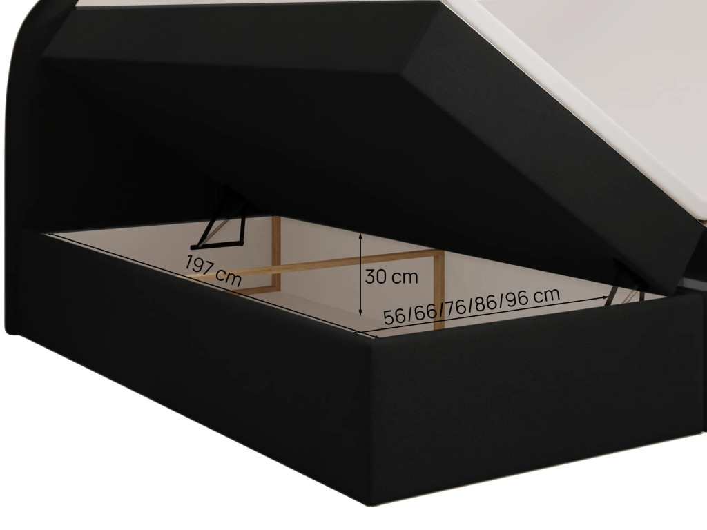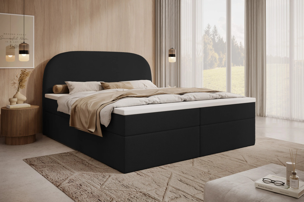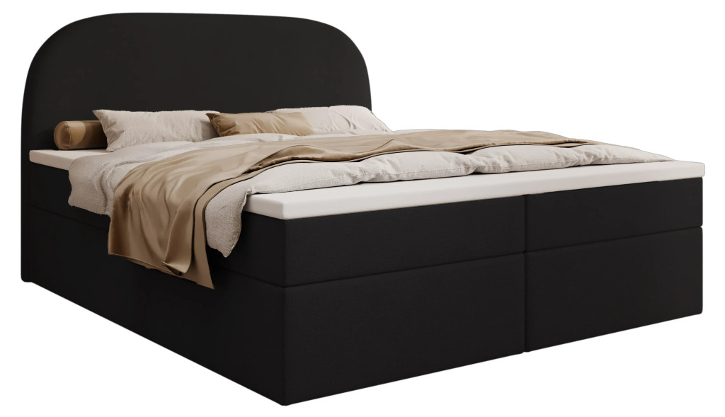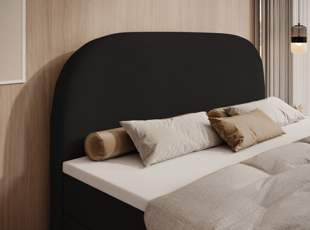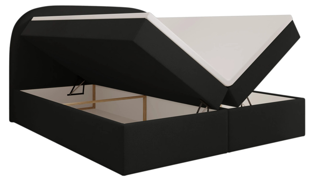 Prémium Boxspring ágy, kétoldali, nagy kapacitású ágyneműtartóval, lamellás ágyráccsal és Bonellrugós H2 matraccal. A 115 cm magas, ívelt fejtámla kényelmes olvasást és tévézést biztosít, a 51 cm-es peremmagasság pedig könnyű ki- és beszállást nyújt; anyaga részben tömör fa váz és tartós struktúrszövet Jasmine 100 színben.