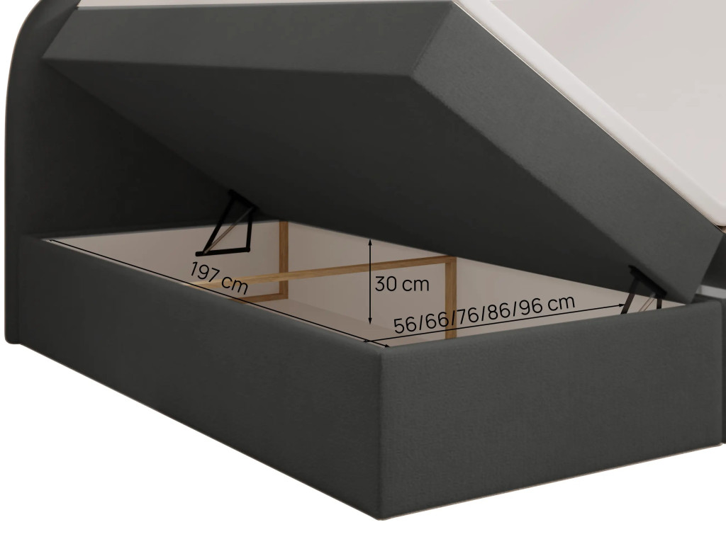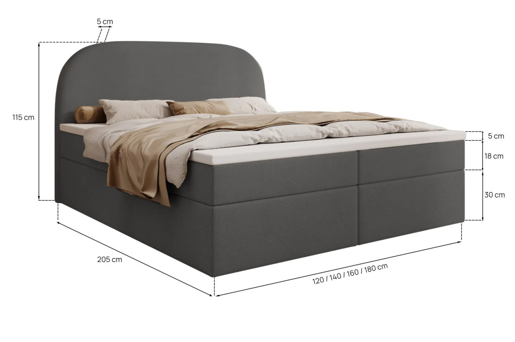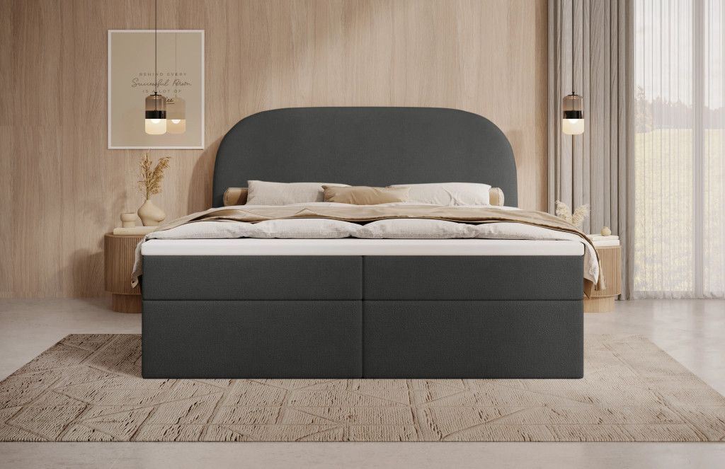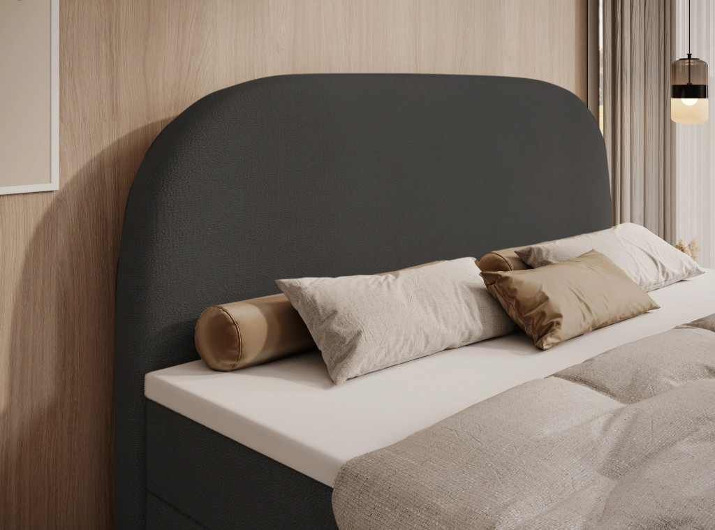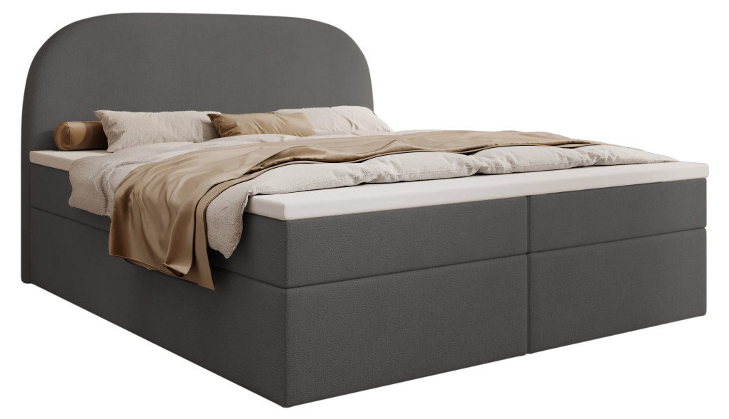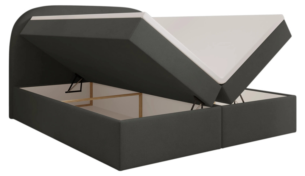 Prémium Boxspring ágy, kétoldali, nagy kapacitású ágyneműtartóval, lamellás ágyráccsal és Bonellrugós H2 matraccal. A 115 cm magas, ívelt fejtámla kényelmes olvasást és tévézést biztosít, a 51 cm-es peremmagasság pedig könnyű ki- és beszállást nyújt; anyaga részben tömör fa váz és tartós struktúrszövet Jasmine 100 színben.